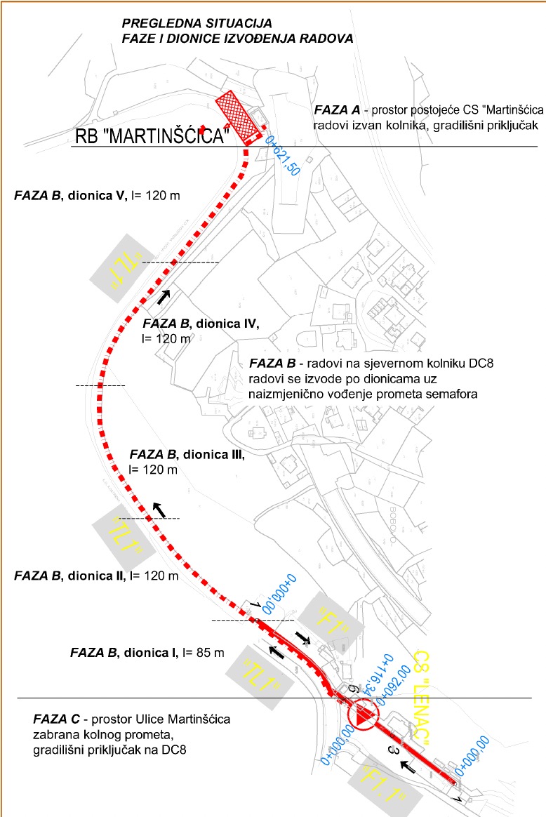Danas, 16. travnja 2026. godine nastavljaju se građevinski radovi na državnoj cesti DC 8, na dionici kolektora TL1 u ulici Martinšćica, od kućnog broja 4 do kućnog broja 1.